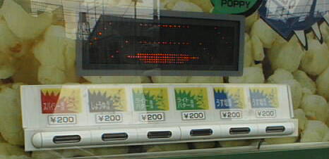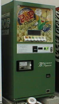 新しいタイプのポップコーン自動販売機。 ドンキホーテというディスカウントショップとパチンコ屋の間にある。 200円とちょっと高いが、スパイシー味、しょうゆ味、ライトバター味、うす塩味の4種類がある。 ためしにライトバター味を買ってみた。 ディスプレイには加熱中の表示が出て約90秒でできあがる。屋外で人通りも多い所なので90秒は長い。 自販機の前で待ってると変な人みたいにジロジロ見られる。 そして出来上がったポップコーンは安っぽい袋に入ってる、熱くてなかなか開けられない。 あっつあっつの出来立てポップコーンを食べてみると・・・これが意外にも熱くない。 焼き具合が良くないのか、普通に売ってるポップコーンを食べるのとそんなに変わらないような・・・。 自販機だからしょうがないのかな?機械の調子が悪かったのか?期待してたほどではない。 しかもこのポップコーン、多分ディスカウントショップで安売りしてる輸入コーンであろう。 ううむ、改良の余地がありそうだ。