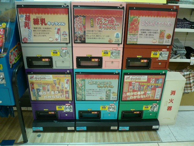 全国各地のご当地キャラメルを販売する自販機。ガチャポンと同じような構造だが、お金の入れ口が2つあり、2つに100円玉を入れるとハンドルが回るようになっている。行った時は、練乳キャラメルだけ売り切れ。写真を見ると分かるのだが、レバーが縦の状態になっている時は売り切れ、お金も入れられない状態。