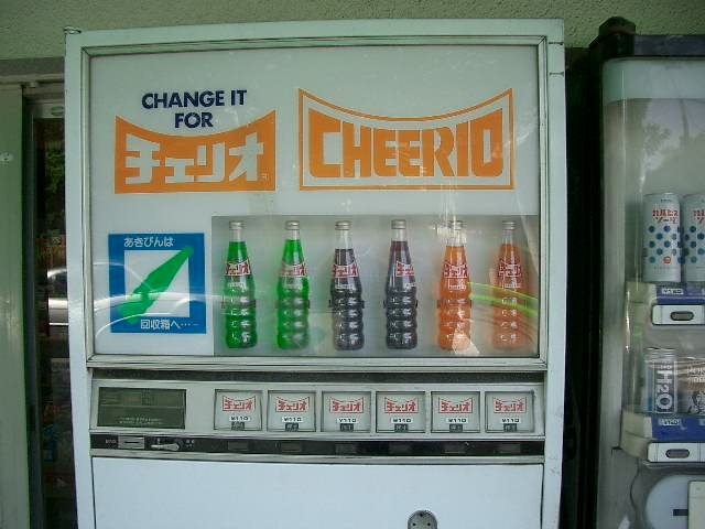 改めまして、目撃情報は、 瓶チェリオ の自動販売機です。稼動しておりました。実際にガンバッてメロンとオレンジの2本を飲んできました。