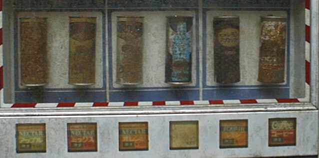 これまた道路沿いに捨ててある自販機。もちろん稼動せず。 売っている(いた)商品は、ネクターアップル、ネクターミックス、ネクターオレンジ、多分ラムネっぽいドリンク、 レモンスカッシュ、アメリカンコーヒーである(写真をクリックすると拡大されます)。 商品のサンプルは全部さびてしまって疲れ果てている感じの自販機だ。 輝いているイメージのこの模様にももう光が灯ることはない。
