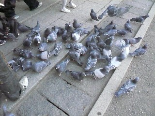 足下は身動きが取れない状態。中には襲い掛かってくるハトまでいる。 ポップコーンを投げると、バーゲン品に群がる人のようにすごいことになります。 |