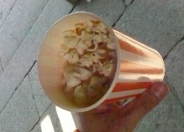 ポップコーンを買って見ました!100円!あまりアツアツではありません、食べてみると普通のポップコーン、不味くはないけど特別うまくもない。 |