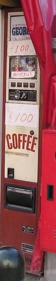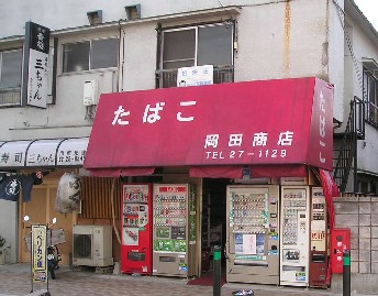 たばこ屋「岡田商店」の前にあるジョージアのスリム自販機。ボタンが4つあるので4種類入れられるはずなのだが、3種類しか入ってない。 使えるのは10円,50円,100円玉だけ。このタイプの自販機は珍しいそうだ。自販機は目立たなきゃ売れないのに、 これじゃ目立たないから撤去されてもしょうがないかな。クボタ製で機種不明。