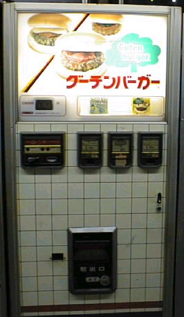 グーテンバーガーの自販機 発見場所:ジョイフル24(群馬県邑楽郡邑楽町)・サンプラザ中野(茨城県鹿嶋市)・オートパーラー(埼玉県栗橋町)・ オートパーラーシオヤ(千葉県下総町)・コインランドリーほしの(東京都足立区)など 購入価格:200円 発売元であるマルシンマックがグーテンバーガーの生産をやめてしまったという情報がある。 たしかにnomが知っているグーテンバーガーの自販機ではどこにも売っていない。 茨城県鹿嶋市のサンプラザ中野、千葉県下総町のオートパーラーシオヤなど、 現在は別のハンバーガーを入れている。このバーガーに思い出がある人が多いだろう。 nomも初めて食べた自販機バーガーは、グーテンバーガーだった。 一度売らなくなったという情報があって、その後復活したが、もう終りなのか? 多くの人が復活を望んでいる! 2002.7.19 ハンバーガーの自販機の中でもメジャーな部類に入る。これは群馬で見つけた物だが、 茨城県鹿嶋市のサンプラザ中野など、いろいろな所にある(かもしれない。) 昔はnomの住んでいる埼玉県草加市でも売っていた。 もちろん味の方は、標準自販機バーガーの味であり、他の自販機バーガーと甲乙付け難い。 確かハンバーガー、チーズバーガー、チリバーガーの3種類があったと思うが、 今はチリバーガーを除いた2種類しか売っていない。しかし群馬は、このグーテンバーガー以外に、 オレンジバーガー、ドナルドクックと3種類の自販機バーガーがあることになる。 3社が競合しているのに、どれも味が一緒とは・・・。 自販機バーガー会社は、他社の味を研究して、「人の味を見て我が味を知」った方がいいと思う。 98.12.19 ![]()