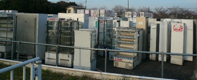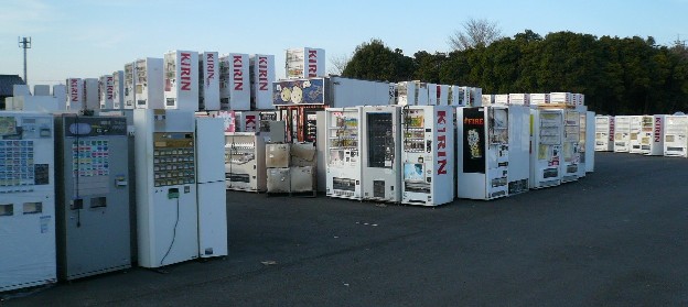 国道122号バイパス沿いの自販機置き場。自販機がドミノのように立てられるが、ほとんどがキリンの自販機。