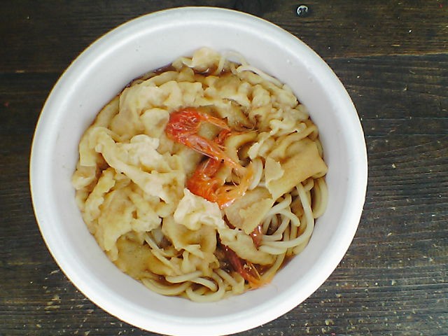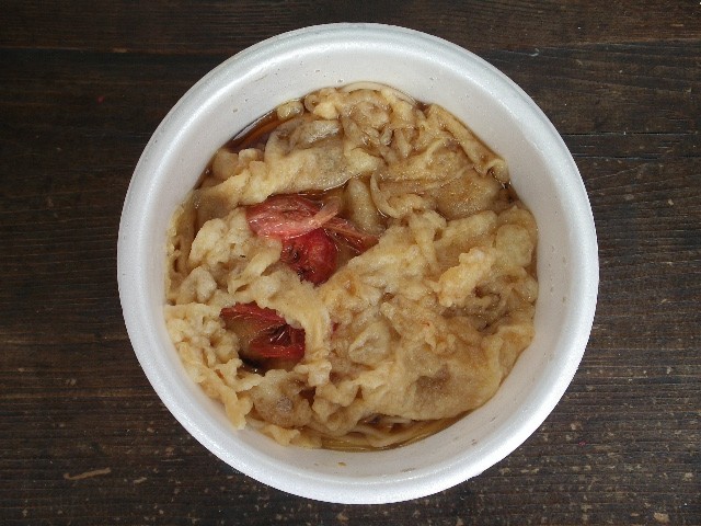 かき揚げではなくて天ぷらの衣と乾燥海老3匹で全てを覆っている。 汁は通常よりも少なめ、金額内で味を重視した結果でしょう。 麺が見えないので一見グロイけど汁を飲むと正統派の蕎麦屋の味。 売れるときで40〜50杯は売れるとのこと。