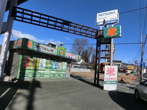 国道122号の旧道?のような場所にある米の自販機。こちらの方が本当の国道なんだけど、あまり通らないだろう。通常、桐生方面の国道122号から丸美屋自販機コーナーへ向かう場合は、大間々駅前を通る道が案内板にも書いてあるし実際に近くて速い。この自販機は残念ながら非稼働、電源コードが自販機の頭から垂れ下がっている。