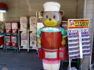 バーベキュー用の品々や名産品、野菜、漬物なんかを売ってるお店、木津川と16 3号線に挟まれたのどかなロケーションにまたなんとのどかな自販機が。このクマちゃんに目を奪われて立ち寄ったものの他 に目ぼしい自販機はありませんでしたニャリ。使用禁止とは書いてないので100円入れたら動いてくれそうニャリ。でも今日は 家族連れも多くて、た〜ちんは恥ずかしくて買えんかった。た〜ちんに子供が授かるまでクマちゃん元気でいてほしいニャリ。