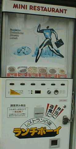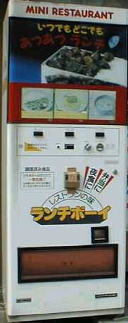 手軽に食事が取れる自動販売機。お金を入れてボタンを押すと、箱型の調理済食品が落ちてくる。 箱の中身は、半分は具、半分は固形燃料である。加熱方法は具を箱に移してひもを引っ張るだけ。 そば類なら約7分、御飯類なら約10分で完了。 ホカホカの温かい食事が取れるが、量は少なめ。 大胡町でも春日部市でも駅の近くにあるのだが、他にも店がたくさんある場所で、 本当にこの自動販売機は売れているのか気になる。我々が購入した物は、賞味期限はあと3ヶ月残っていた。 埼玉県八潮市にも存在するが、全ての商品が50円高い。東京に近いせいか。