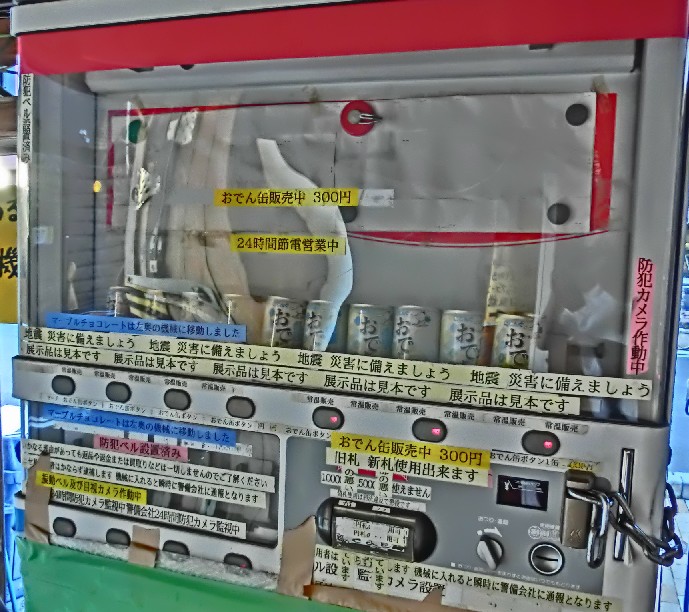 下はおでん缶の自販機。シールベタベタ貼りすぎて訳が分からない。
