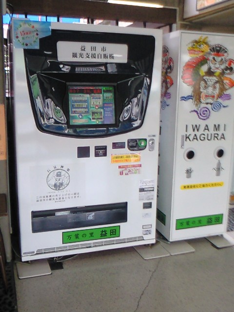 牛乳さんからの情報です。ありがとうございます。 自分は島根県益田市に住んでいます、その益田市とコカ・コーラが提携して市内限定で設置している自販機です。 自販機の売上の一部が、益田市の観光事業に使われるという塩梅です。 懐かしい、ノスタルジックとは一線を画したハイテク仕様自販機です | ||