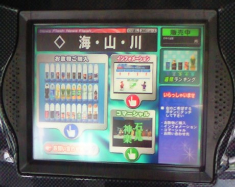 | その自販機の真ん中にある、ディスプレイのアップです。 観光事業絡みだけあって、益田市の各種情報や名物石見神楽のPV映像、果てはその自販機の売れ筋BEST5の紹介されています。 ディスプレイ周辺はカーボンを配置してやたらサイバーぽい雰囲気です 設置場所は、益田市役所ロビーです。 |
