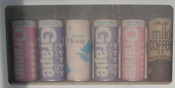 かなり古そうな明治マイルドコーヒーの自販機。屋根があるおかげで損傷も少なくサンプルもほぼ完全な状態で残っている。 2台並んでるうちの一つは明治ドリンクスカットの自販機。マイルドコーヒーとオレンジドリンクは分かるけど、 ユニオンのオレンジジュースやグレープジュースは初めて見た、炭酸飲料、無果汁でファンタみたいなドリンクのようだ。 あと目をひいたのが下のふくろうのマーク、一瞬ウーホーかと思ったよ。自販機筐体はサンデン製、機種は不明。