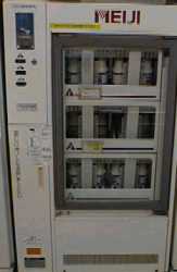牛乳自動販売機 発見場所:群馬県伊勢崎市、埼玉県草加市など 購入価格:100円 伊勢崎市ではドライブイン内、草加市ではお菓子屋の前にある、ビン入りの牛乳を売っている自販機。 お金を入れて商品(といってもノーマル牛乳とコーヒー牛乳の2種類だけ) を選ぶと、自販機内にある牛乳の在庫の中から、一番前面に見える牛乳が押し出される。 そして窓を開けて商品を取り出す。この自販機は、中の牛乳の押し出され方がレトロな(そしてちょっとマヌケな)感じでたまらない。 別に牛乳が飲みたい訳じゃないのに、ついつい買ってしまう。 99.1.5 バンバンさん情報です。ありがとうございます。 前原商店に設置されたMEGMILKの瓶の自販機です。 最近、パック飲料の自販機でよく見かける商品番号を選ぶと アームが商品棚から押し出された商品を下ろしてくれるタイプです。 コーヒー牛乳、おいしい牛乳、いちごなどがあります。 nomも横浜のどこかで同じ自販機見た。最近牛乳の瓶自販機はこのタイプが多いみたい。 |