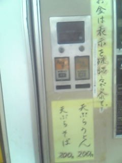 そばの自販機には手書きの注意書きが・・・「10円玉は使わないでください」「うどんのランプがつきません」など。修理できないんでしょうね・・・