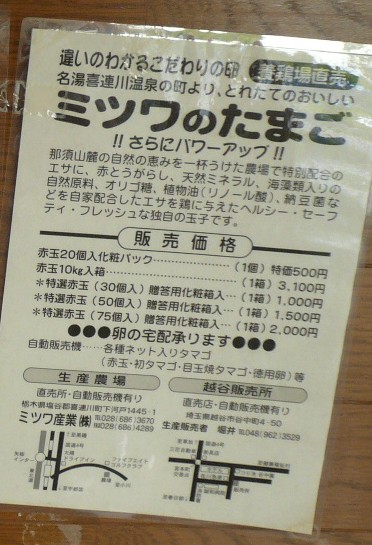 販売価格:200〜300円 ネットサーフィンをしていたら偶然見つけた、越谷市谷中町にあるたまご自販機。横には販売所もある。 赤玉300円、白玉200円、初タマゴ300円、朝採りタマゴ500円。 試しに赤玉を買って食べてみたがかなり美味しい!夕方に行ったが朝採りタマゴは売り切れ。nomの前にも後にも客が来て盛況してた。 自販機は最新式か?ボタンを押すと扉が開くタイプで、卵自販機にありがちな購入ミスもなく安心。 行き方は、国道4号バイパス宮本町交差点をホテル側に曲がります、目印はホテルと山田うどん。そして少し行くと右側に細い道があるので右折。 さらに、次の交差点を左折。卵の販売所が見えてきますので、すぐ分かります。駐車場はないですが数分なら路駐OKでしょう。 バスも通る道なので長時間の路駐は迷惑がかかると思います。 ホームページ http://www.citydo.com/prf/saitama/guide/sg/250002445.html 2008.6.17 |