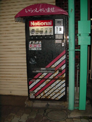 ちょっとした商店街の電気屋さんでもよく見かけるナショナルの電池自販機。 売ってる自販機は単1、単2、単3、単4でまた単3に戻る。最初の4つはマンガンで後の1つはアルカリっぽい。 そろそろオキシライドも入れた方がいいかも。果たしてどのくらい売れるのか、電気屋のみが知る謎だ。