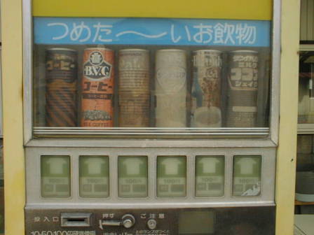 かなり古い自動販売機。500円玉が使用不可ではなくて、存在しない時代の物である。