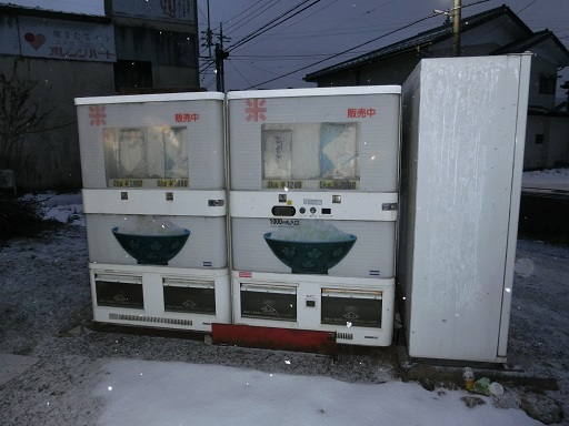 沼田市の国道291号沿いを走っていたら発見。朝6時頃だったが点灯していたので販売中かと思ったが、中止の張り紙が。非稼働なのかどうかはわからない。売っている米はパッケージだけでは分からないが、地元の農家が作った米のようだ。10kgで3000円の物から10kg2000円、2kg1200円の物がある。10kg2000円なら結構安いのでは?そして自販機の裏の建物にはオレンジハートというコンビニの看板。お、お、オレンジハート、何か関係あるのかなと思ってしまう。