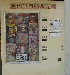 週刊誌自動販売機 発見場所:東京都足立区西新井 販売価格:200円〜 レトロ感覚あふれる週刊誌の自動販売機。売っている雑誌は最新の物ばかりだけど、この外見が気に入った。 これは本屋の前に置いてあり、おそらく本屋で売っている雑誌をこの自販機で売っているんだと思うが、撮影した時はその本屋が休みだった。 中に入っている雑誌は、週刊ジャンプ、マガジンやアダルト系など、ほとんどがマンガ。 東京23区内でこれだけ古びた大きい自販機が置いてあるのは、かなり珍しい。 土地が高いんだから、これを置くスペースに別の本を置いた方が商売としてはいいと思うんだが。 でも、こういう自販機を今でも置いてくれているこの本屋は、nomにとっては尊敬に値する。 メンテナンスが大変だし、あまり儲からないと思うけど、撤去しないで頑張ってほしい。 98.1.28 |