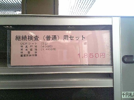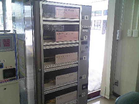 ともちゃんさんからの情報です。ありがとうございます。 どうやらこの自販機で自動車の各種手続きに必要な申請用紙や、登録事項証明・継続検査の手続きに必要な書類や印紙、収入証紙のセットを販売しているようです。 この自販機が全国の陸運支局に配備されているかどうかはわかりませんが、ちょっと面白い自販機でしたのでご報告をさせていただきました。 これは面白い。面白いんだけど、申請の受付には人がいるんだし、人が売っててもいいような。 人手が足りなくて困ってたりするのかな、最近どこも人員削減してるし。 検査印紙400円+審査証紙1400円で1800円だと思うのだが1850円、他のものまとめて50円かなぁ。 2010.6.3 |