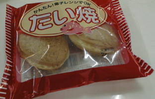 の中に入っているたいやき。 これと、焼きそば・エビピラフはなんと200円で買える。他のカツ丼などは高いまま。 このたいやきは、袋から出して皿にのせて温めるので少し手間がかかる。 味は別に普通の冷凍食品のたいやきである。