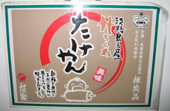 相模のGL乗りさんからの情報です。ありがとうございます。 なんでも、この「たけやん」は名産品らしく、旨い物大好きな 私は「たけやん」の味を検証すべく、仮眠を取ったあとにこのSA よりさらに徳島方面に走った所にある淡路島南PAにて「たけや ん天ぷらうどん」を食べました。結果はなかなかのモノであり ました。ちくわの味がしっかりして美味かったですよ。 あと、パーキング標識の上に「自動販売機」とわざわざ表記し てあるのもユニークでした。 牛乳パックの自販機を使っているのかなぁ。わざと自販機に納まるようなサイズのちくわを作ったのか、それともたまたま自販機で売ることができたのか。 これは売れるでしょう、淡路島名物がお手頃価格で食べられるのだから。このイラストもほのぼのしてていいね。 竹にちくわを巻くとはユニークな食べ物だ。 2008.4.4 |