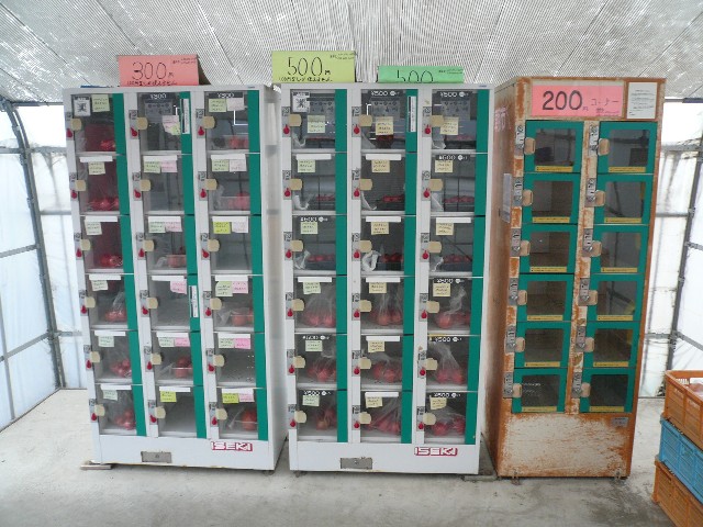 ビニルハウスの屋根のついたトマトの自販機で、価格は200円〜500円。
