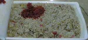 これがここの弁当自販機で売っているチャーハン。280円。紙のパックに入っており、温まって出てくるまで2分くらいかかる。