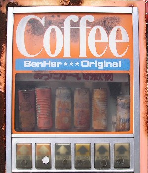 商品を押すボタンには射撃の的になったような穴もある。何がオリジナルなのか、アメリカンコーヒーはどこが作ってるのか?混乱してしまう自販機だ。