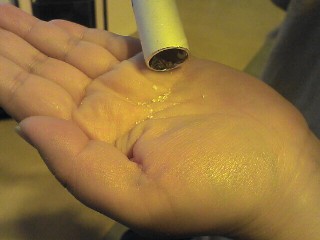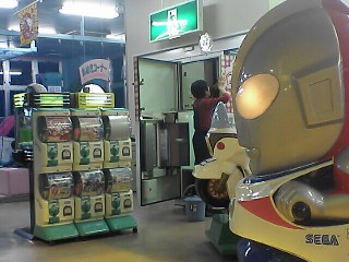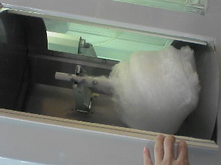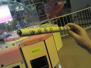 サトーさんからの情報です。ありがとうございます。 割りばしの代わりとなる筒状の棒のなかに、ざらめが入っていて、上から 棒がおろされてくると、封をしているアルミテープをやぶって、綿あめの出てくる ドラムにざらめが放出されます。 棒をまわして綿あめを巻きつけるのではなくて、ドラムのほうが回転して、綿あめ を棒に巻きつけていきます。 茶色いざらめではなくて、白い氷砂糖のような砂糖が入っていました。そのため、 べとつきがなくて手で触ってもサラサラしています(手が映っている写真)。 食べていたらおばちゃんがなかを開けて掃除をしていました(最後の写真)。 閉店間際だったので、おそらく毎日清掃していると思われます。 ドラムの部分は分解して拭き掃除しており手間がかかっていましたが、商品補充 は、例の棒をマシンの上のストッカに入れておくだけのようで、面倒さはないようです。 ちなみにここのゲームコーナーは古い機種ばっかりです。太鼓の達人とかもあるけど。 わたがし自販機は、つくば山や埼玉県川口市の手動タイプばかりだと思っていたけど、実は自動もあってびっくり。 これが自販機として出てきたってことは手動タイプは自販機とは呼べない? わたがし1つで200円はチト高いような気はするけど、あったらぜひ試したい自販機だ。 2008.7.23 |