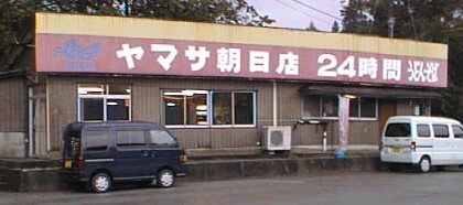 以前の店名はヤマサ朝日店。 山形〜新潟3日間の調査で、動作する自販機が置いてあったのは実はここだけ。置いてあるのは天ぷらうどん・そば300円。 ポテルカの自販機200円。ごく普通の自販機コーナーだ、もっと品揃えが欲しかった。辺りは日本海にも面してなくて、 店もまばらなところ。