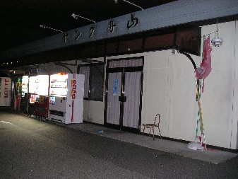店舗の前に自販機が並んでいて、店内にも飲み物の自販機や回転式自販機(動作しない)がある。