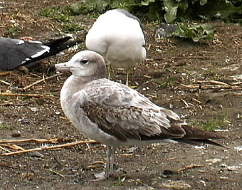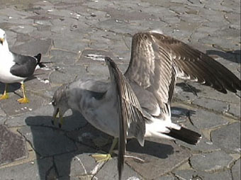 | 雌雄同色。 成長の尾羽に黒い帯があるのはウミネコだけであることから、英名は、Black-taild Gullと呼ばれている。 夏羽: 上面は濃い青灰色で、頭部・頸部・部胸・上尾筒・下面は白い。 初列風切は黒く、先端に白い斑がある。 嘴(くちばし)は大部分が黄色で、先端は黒帯、最先端には赤斑がある。 脚と水掻きは黄色。 光彩は淡い黄で、赤いアイリングがある。(写真下参照) 冬羽: 頭部、後頸に灰褐色の縦斑があり、脚・嘴の黄色が淡くなる。 幼鳥: 全体に焦げ茶色で、嘴は灰色ぎみの淡い赤色で先端が黒い。 尾羽は黒褐色で、脚は灰色ぎみの淡い赤色(写真下参照)。 鳴 声 「ミャー ミャー」と短く区切って鳴く。 その鳴き声がネコの鳴き声に似ているところから、和名は、ウミネコ(海猫)と呼ばれている。 繁殖地での鳴き声は、繁殖生態の各ページに行動に伴う鳴き声を掲載してあります。 生 態 分 布 旧北区。 分布: オホーツク海、日本海、千島列島全域、日本列島の太平洋沿岸に繁殖分布し、 越冬: 冬は、中国大陸沿岸、台湾まで移動して越冬する。 日本では、北海道、本州、九州の沿岸各地で繁殖し、繁殖後・冬期は各地に移動分散する 分布・移動 マップ。 繁殖地が日本とその近海に限られているため、繁殖地が天然記念物に指定されている場所もある。 生息地 岩礁、沿岸、内湾、魚港、干潟、河口に多く、河川、池にも入る。 樹林には入らない。 各地の海岸線に沿って飛び、洋上にも出る。 一年中、群れで生活し、岩礁、漁港、港の堤防、河口の中州、砂浜などに集団で休息し、 時々いっせいに飛び立っては元へ戻る行動をする。 群で漁船に集まったり、帰港する漁船を追って港に入ってくる。 海が荒れたときは、大河川を遡ったり、市街地にも入り、体についた塩分・寄生虫を落とすときは、淡水池などで水浴びをする。 繁殖期には、露地・草の生えた露地で断崖がある岬や島、沿岸の無人島、岩礁などにコロニー(集団営巣地)をつくる。 繁殖しない若鳥は繁殖地へ行かず、越夏するのもいる。 採 食 動物質食。 海上や海岸を飛びながら、水面や地上の食べ物を探す。 ウミネコは水に潜れないため、飛びながら採食、上空から水面に浮き上がってきた魚などを採食、泳ぎながら採食する。 漁船に群れで付きまとい、船の上空を旋回しながら次々と降下や、ホバリングをして、漁船からこぼれた魚を採食する。 拾い屋のウミネコは、漁港などに落ちている魚、加工場から出るアラ、甲殻類、動物の死体などを採食する。 また、海荒れや濃霧のときには10kmも内陸部に入り、昆虫(アブ類)、オタマジャクシなども採食する。 繁 殖 繁殖期: 4-7月。 一夫一妻。 つがいは約1メートル四方の縄張りをもち、コロニーに分散する。 縄張り: 縄張りを取り合う縄張り争いをして縄張りを形成し、形成した縄張りへ接近・侵入する個体を、雌雄で激しく防衛する。 縄張り形成時、防衛時の争いは、嘴を挟み合って引っ張り合ったり、翼を嘴で挟んで引っ張り合う争いなどをする。 巣づくり: 雌雄が協力して巣をつくる。 地上の窪みに枯れ枝・草、木片、海草、漂流物などを敷いて巣をつくる。 産卵: 1巣卵数、1〜4卵。 希に6卵もある。(2-3卵が多い) 抱卵: 雌雄が2-3時間おきに交代して抱卵する。 私の観察では自然に抱卵交代をし、希に押しのけ交代で抱卵をした。 孵化: 24-25日で孵化する。 雛は早成性の半離巣性。 育雛: 雌雄が給餌をして子育てをする。 生後2-3日間は、自然に雌雄交代で抱雛し、強引な抱雛交代は見られない。 雛は45日ほどで、「突き放し」をされて巣立つ。 繁殖生態は、写真・解説で詳しく掲載しました。ご覧ください。 求愛のディスプレイは、グランドディスプレイをする。 メスがオスの嘴や喉を突っついて餌をねだり、メスが嘴を空に向けて「ミュー」と鳴く、カモメ類独特の求愛をすると、 オスはメスに応えて、半消化の魚などを吐き戻して、メスにプレゼントする・・・求愛給餌を行う。 非繁殖期は、群で生活する。 |