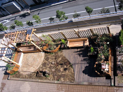 | 北西から見た全景 | 北側パーゴラ下 | 南側ベンチ、植木鉢、花壇、水鉢 |