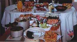 ファミリーが知人を招いたり、自分が友達のファミリーのディナーにおじゃましたり、というちょっとしたホームパーティは日常茶飯事。招かれた方は、てみやげを持って行くのが基本です。(ワイン、花、チョコレートやケーキなど)わたしのファミリーが知人を招く再、テーブルセッティングを手伝うのが楽しみでした。イギリス人同士の会話はついて行くのが大変なんですが、ワインとともに豪華な手料理、ああ、これぞホームパーティ♪ |