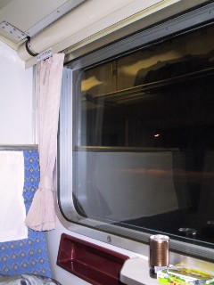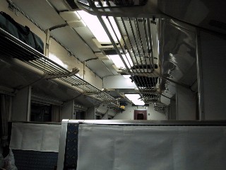 乗車したのは普通座席車です。座席車といっても、元は寝台車。天井は高く、まだ、ベットが収納されています。網棚の上が上段、背もたれの上が中段の3段B寝台です。見るからにも狭いですね。 |