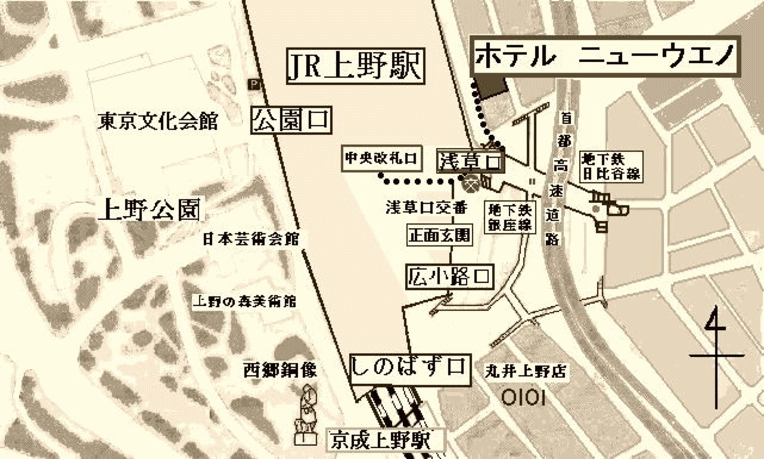 JR上野駅中央改札を出てすぐ左に曲がりますと、浅草口がございます。浅草口を出て、左の駅沿いの道4軒目が当ホテルでございます