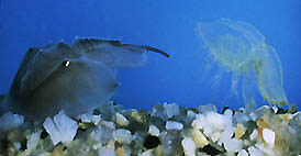 カブトガニは、冬眠から覚める6月半ば頃、海水温が18度になると活動をはじめ、抱合・産卵・孵化....などの繁殖と、採餌・休息・脱皮など、生活の全てが内湾の汽水や干潟で、行われています。 干潟は、カブトガニをはじめ多くの生物にとって、重要な生息場所です。 干潟では、カブトガニの成体や幼生が、ゴカイやアサリなどの底生生物を捕食しています。 |