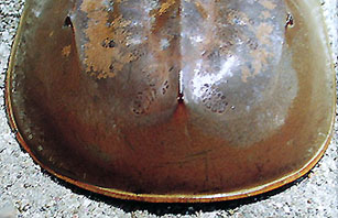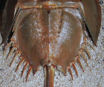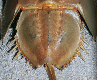 カブトガニの後体は、ほぼ6角形。 その複雑な体が脱皮をさらに困難にさせて、脱皮時の死因につながっています。 |