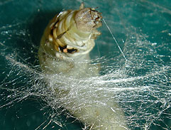 繭を取り巻く足場糸 完成した繭を蔟から取り出して見ると、繭は足場糸に取り囲まれています。 その足場糸の外側は、上部、壁面、床面の6面で、蔟1区画の形どおりです。 繭は6面の足場糸に支えられているため、蔟との接点が無い繭は浮いています。 カイコは繭を作るために、まず丈夫で風通しの良い足場を作ります。 次に外側の足場から内側へ内側へと繭の形を作り、繭の中で繭層を厚くして 繭を完成させます。 なぜ、カイコは繭を作るの? カイコは、脱皮して蛹になります(蛹化)。 蛹化したばかりの蛹は皮膚が非常に柔らかく、わずかなことで皮膚が傷みます。 また、蛹は羽化して成虫になる前まで、眠の状態です。 動いて移動できない無防備な蛹のとき、蛹を襲う鳥類、アリ・昆虫類など天敵、 風雨・細菌などから守られて、安全な住みかである繭の中で蛹化する訳です。 |