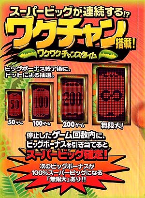 これの売りは「わくわくチャンス」と言うゾーンがあり、そのゾーン内でBIを引くとスーパーBIGとなるタイプ。要はアルゼの「ファイヤージャンボ」タイプなのねん。