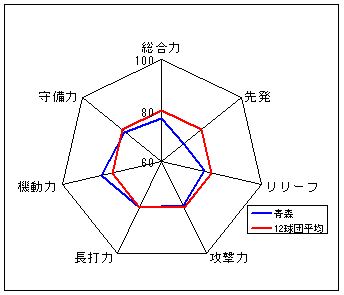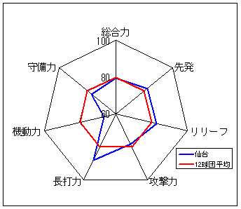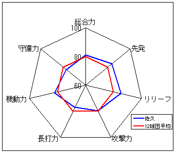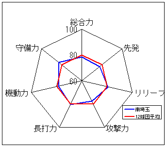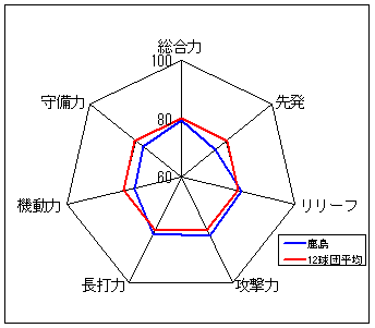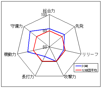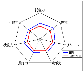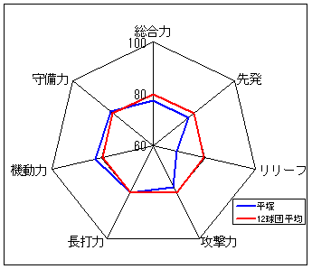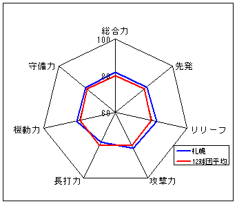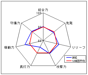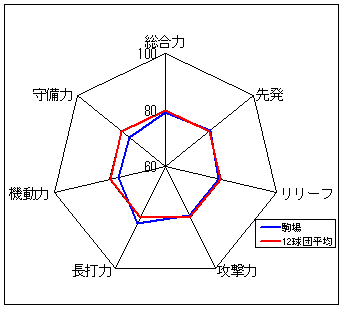 コメント:圧倒的な守備力を誇る。長打力不足だが、総合力では一歩リード。6年度以来のリーグ優勝は近い?