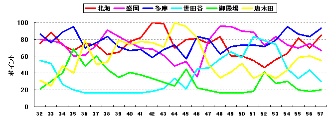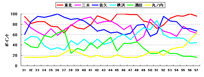4連覇中の東北だが今シーズンも圧倒的優位は変わらない。昨シーズンに比べ若干の戦力ダウンはみられるものの、東北を追撃すべき佐久、三木の2チームも戦力は低下傾向で、東北との差は大きいままだ。その対抗馬の一員に名を連ねそうなのが丸ノ内。前チームを引き継いだ後からじわりじわりとチーム力を整えてきたが、ここに来て一気に戦力のアップを図ることが出来た。総合力では佐久、三木と同等と言っていいだろう。横浜は戦力低下傾向なのは変わらないが、昨シーズンが底だった感がある。もともと地力はあるチームだけに、来期以降が非常に楽しみな存在になるような気がする。酒田は正直、かなり厳しい戦いになると言わざるを得ないだろう。好守とも他チームに大きく水をあけられている状態で、早期のチーム体制の整備が望まれる。