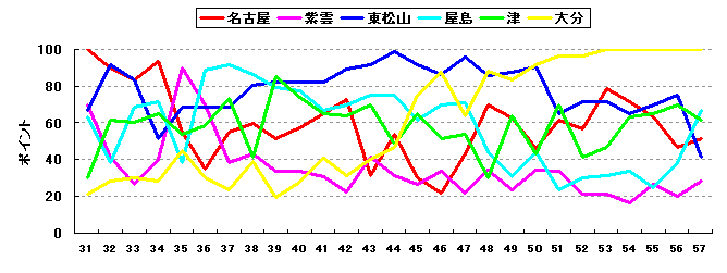 大分のV5の確率は限りなく高いと言えるだろう。しばらくMリーグの興味は大分の連覇がどこまで続くのかと言うくらい戦力は充実している。しばらく大分のライバルチームだった東松山は昨シーズンに続き下位に沈む可能性が高そう。昨シーズン2位に躍進した津は今シーズンもAクラスは確保しそうだ。最も戦力のアップが見られたのが古豪・屋島。持ち味の守り勝つ野球が復活しつつある。大分の連覇阻止に一番近いのは屋島だろう。名古屋は全体としては戦力は低下傾向。今は再浮上に向け、力を溜めている時期か。紫雲は徐々にではあるが、チームの状態は上向いている。新チームとなって5シーズン目。そろそろ結果が欲しいところ。