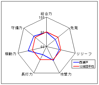 | 9年度 | 西田 | 6位 | 53 | 80 | 2 | .398 | .241(7) | 4.09(9) | 86(10) | 125(5) | 475(9) | 567(9) |