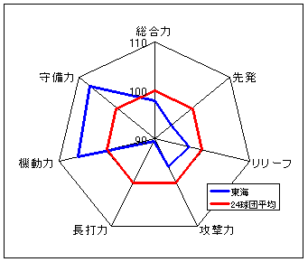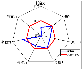防府の投手陣は相変わらずハイレベル。守備も万全でそう簡単には打ち崩せそうもないが、それに対抗できそうなのは三木と北海の打線。三木は基本は打力のチームだが、チーム全体のバランスも悪くない。防府の独走を序盤から許さず食らいついていけば勝機はある。北海は全球団でもトップクラスの強力打線を持つものの、守備力が問題。投手力は悪くはないのだが、ある程度の失点は覚悟が必要か。津は機動力野球で5年ぶりのAクラス入りを目指す。西瀬戸は守備力に不安が残るが、投手力・攻撃力は悪くない。鳥取はチーム力は年々上がってきていたので、オーナー辞退が残念。エース・スパルトイ、主砲・草薙に期待がかかる。