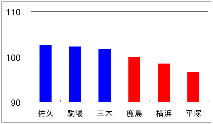 | 12 | 鹿島 | 100.0 | 101.2 | 99.7 | 98.7 | B | 7 | 17 | 15 | 19 | 17 | 14 | 12 |