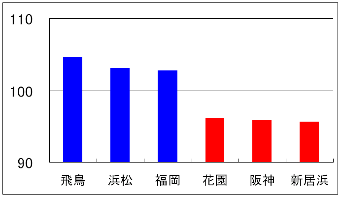 | 6 | 福岡 | 102.8 | 93.5 | 104.6 | 112.1 | P | 10 | 2 | 1 | 2 | 5 | 9 | 10 |
