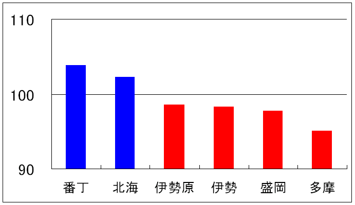 | 10 | 東海 | 102.3 | 109.3 | 103.2 | 91.4 | M | 14 | 18 | 7 | 6 | 3 | 7 | 4 |
